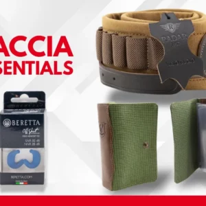 Accessori pratici per la caccia: cartuccera con 25 celle, porta-documenti e mini headset Beretta. Tutto l’essenziale che serve per muoversi in modo ordinato sul campo.
