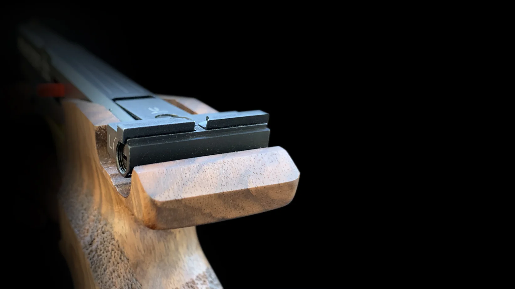 L’impugnatura anatomica in noce è disponibile per destri e mancini, in sette taglie diverse: dalla XXS alla XXL. Il peso anteriore sotto la canna è rimovibile per personalizzare ulteriormente il bilanciamento.