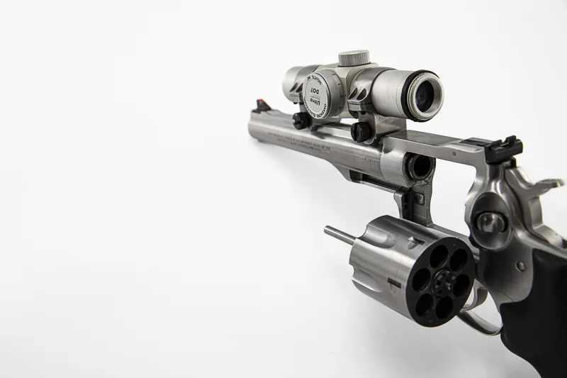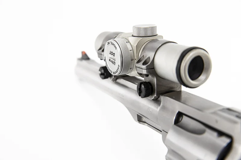Revolver RUGER Redhawk .44 Magnum con ottica UltraDot. Modello robusto, seating 6 colpi, in acciaio inox, ideale per caccia e tiro su bersaglio.