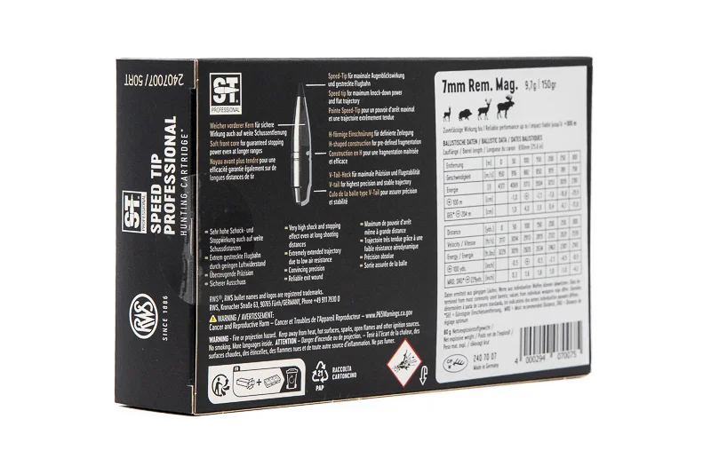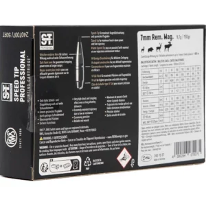 Le cartucce in calibro 7mm Remington Magnum con palla S-Tip da 150 grani uniscono velocità iniziale elevata e stabilità in volo, garantendo precisione e potenza anche a distanze impegnative. La particolare conformazione dell’ogiva assicura un’ottima aerodinamica, mentre la costruzione S-Tip favorisce un’espansione affidabile e un trasferimento di energia controllato.